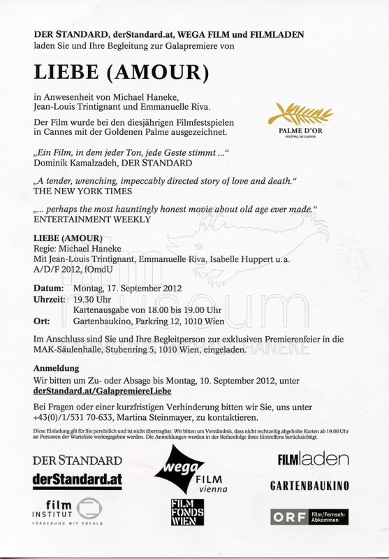 | enthält: | 1 Exemplar (dt.), Einladungskarte zur österreichischen Galapremiere von "Liebe" / "Amour" am 17. September 2012 im Gartenbaukino |