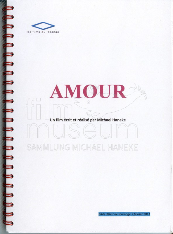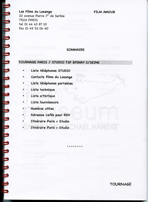 | enthält: | 1 Exemplar eines Produktionsbooklets für die Dreharbeiten zu "Amour". Enthält u.a. die Kontaktadressen, Telefonnummern von Cast und Crew, Anfahrtspläne zu Location und Studio, Notfallnummern, usw. |