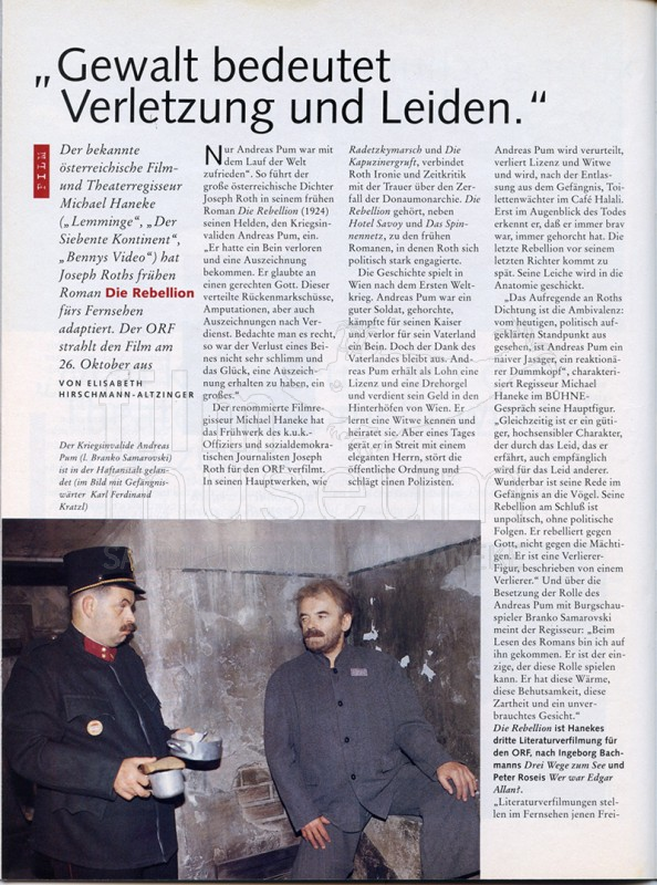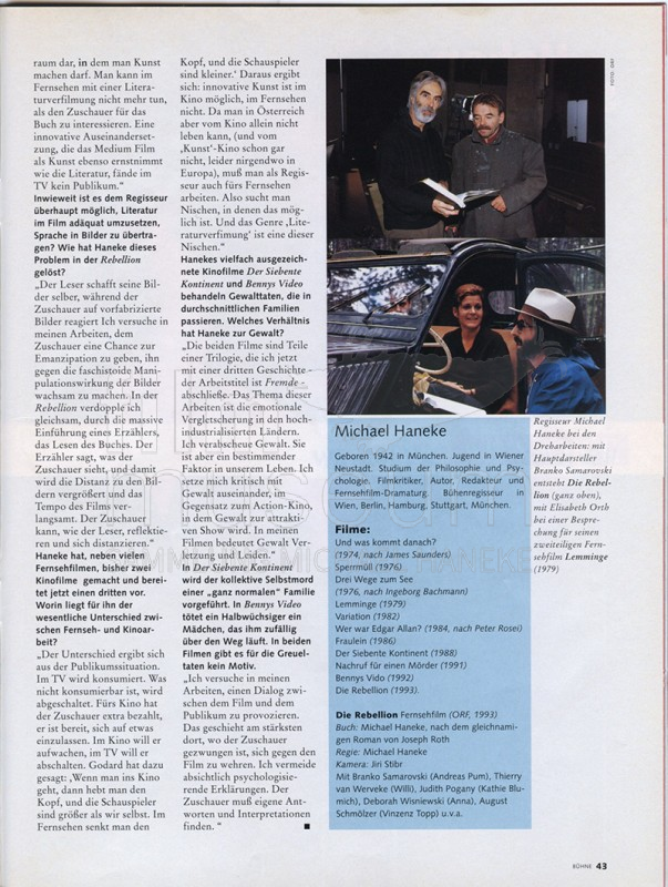 | enthält: | Interview mit Michael Haneke zum Film, Abdruck Szenenfoto mit Branko Samarovski und Karl Ferdinand Kratzl, Abdruck Produktionsfoto mit Michael Haneke und Branko Samarovski während der Dreharbeiten |