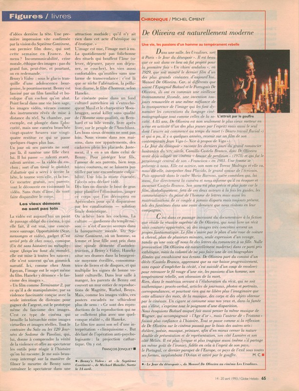 "Quand les images poussent au crime" von François Jonquet, in: Globe, Nr. 10/1993