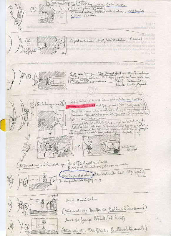 | enthält: | 1 Exemplar mit handschriftlichen Anmerkungen und Skizzen (Storyboard), Musikliste, Stopzeitenliste der einzelnen Szenen, Geräuschübersicht, 1 Notizzettel, Darstellerliste vom 20.10.1993, Stabliste vom Juni 1993 |