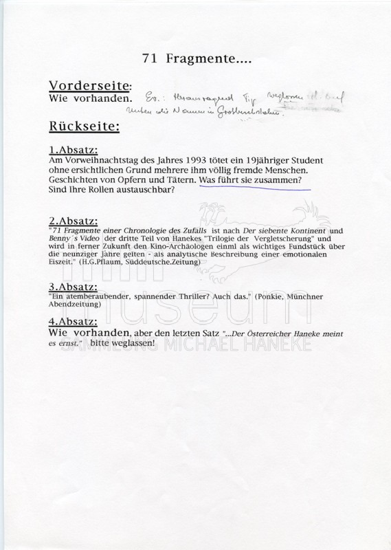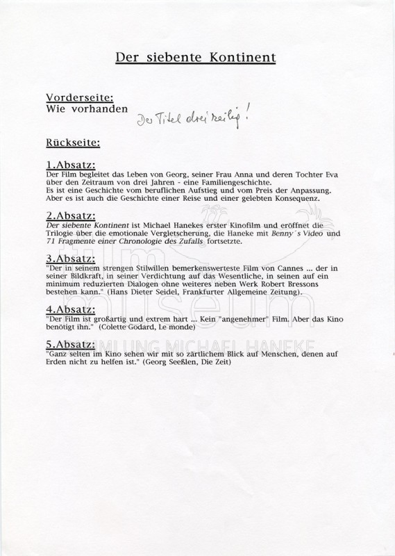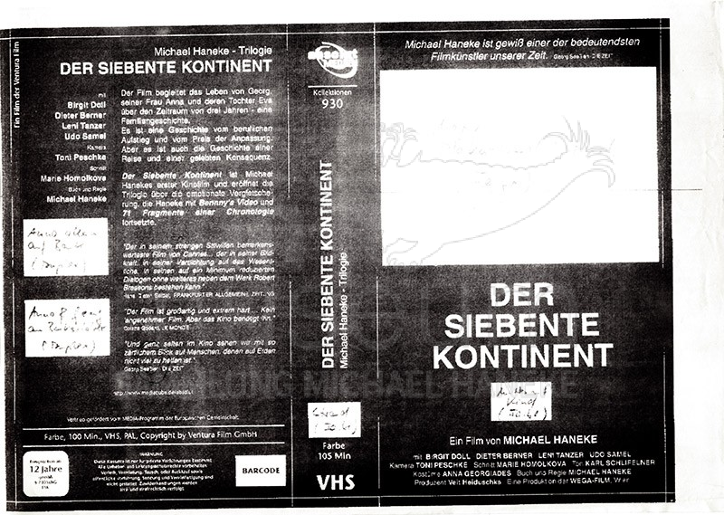 | enthält: | 6 Fahnen zu VHS-Videocover (Thermopapier) von Ventura Film (Hans Christian Bose) mit Hanekes Kommentaren, 3 Blätter Textvorschläge/Änderungen zu VHS-Videocover der Trilogie, 1 Fax von Ventura Film (Heidrun Podszus) an Wega-Film (Veit Heiduschka), 3 Blätter zu Vertriebs- und Kontaktdaten von absolutMedien GmbH, 1 Werbeinserat von Triangelfilm Video (Stockholm) zur Trilogie, 1 DVD Cover zur Trilogie (gedruckt) der Opening Distribution Group (Frankreich) |