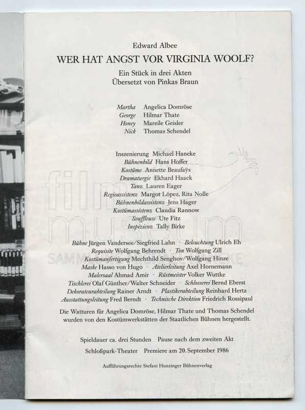 | enthält: | Texte von Edward Albee, Simone de Beauvoir, Ivan Nagel, Paul Watzlawick, Carl von Clausewitz, August Strindberg, Max Lerner, L.L. Matthias. Programmheft zu Hanekes Inszenierung von "Wer hat Angst vor Virginia Woolf?", Schloßparktheater Berlin. Premiere: 20. September 1986 |